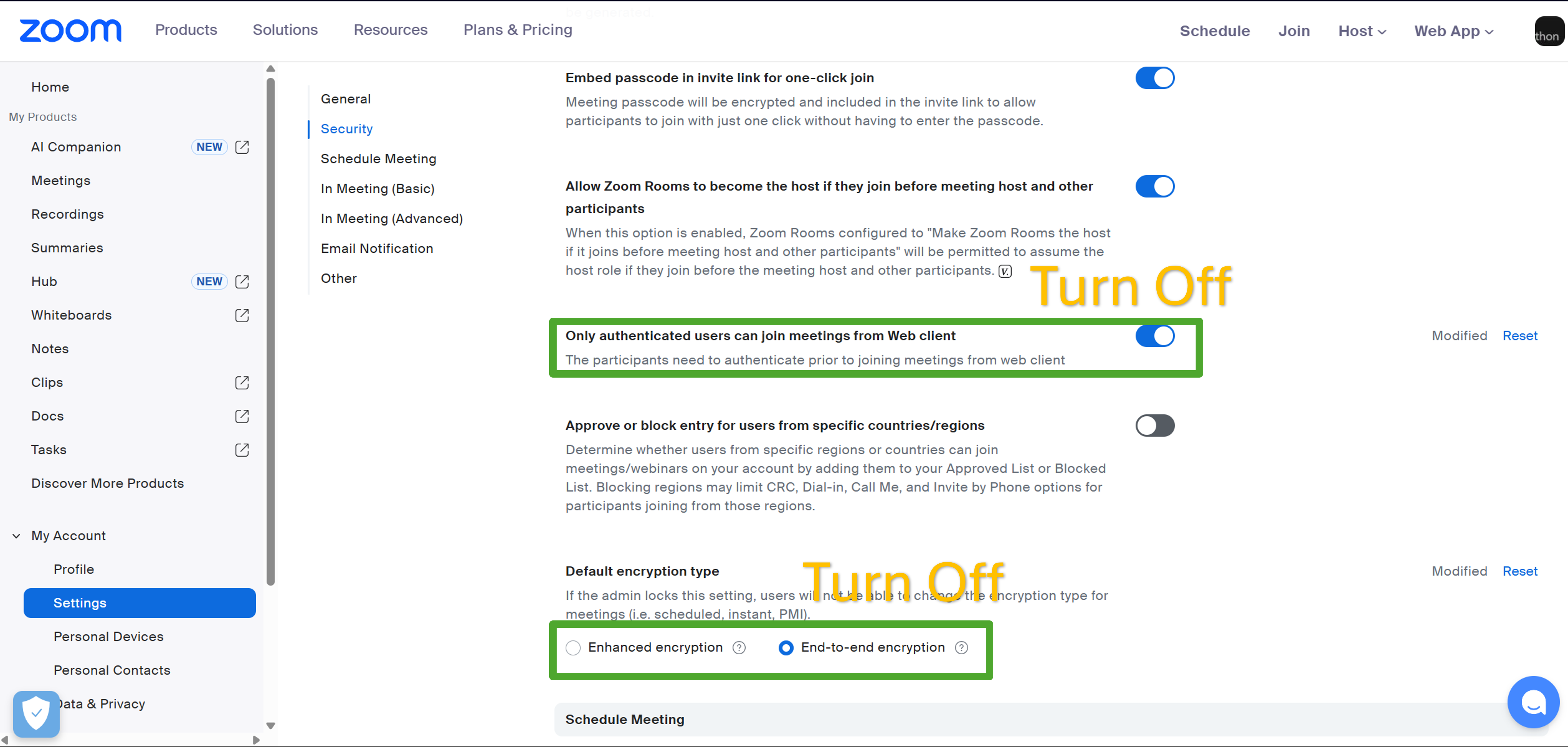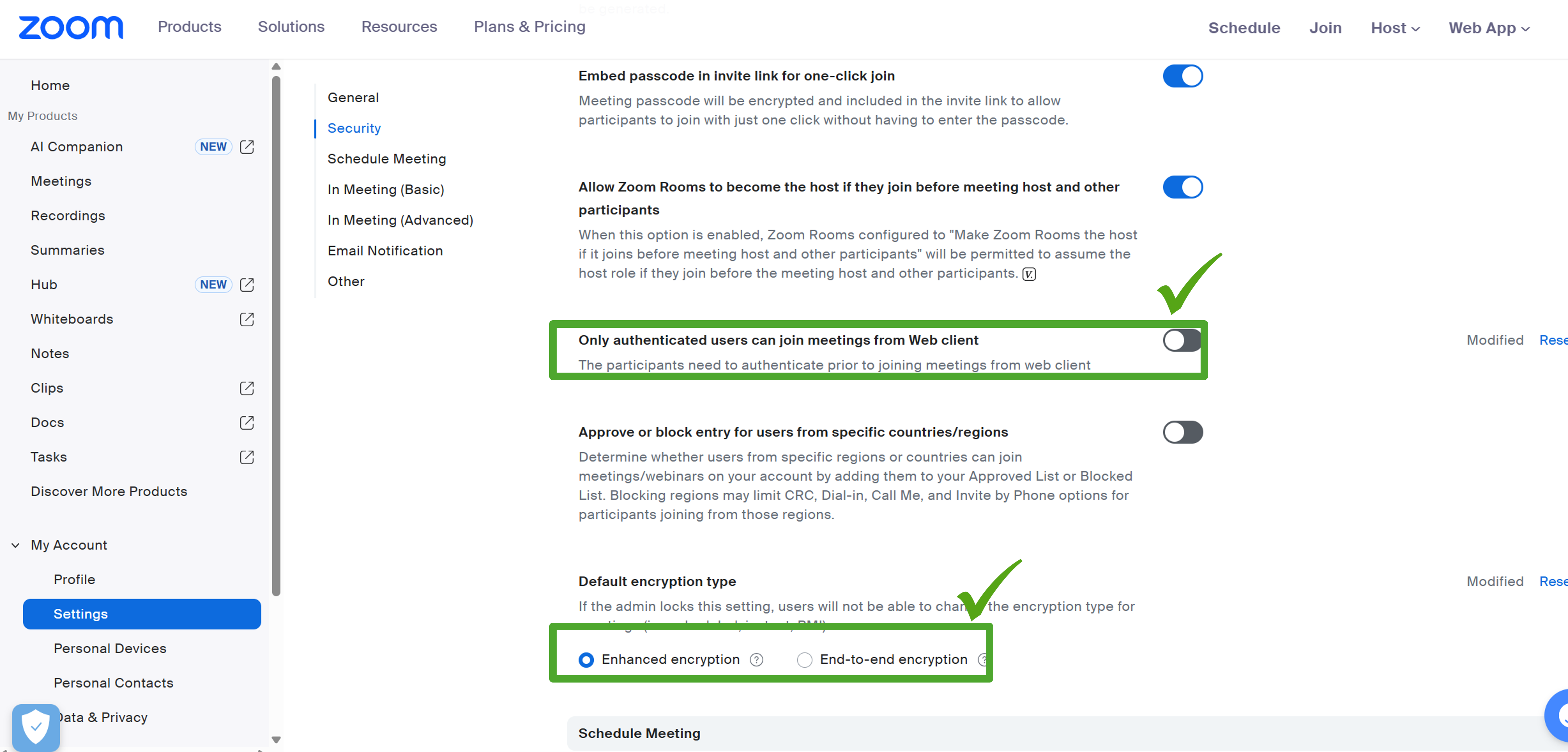 Navigate to: Meeting β Security and ensure required configurations are set before sharing Meeting ID and Passcode.