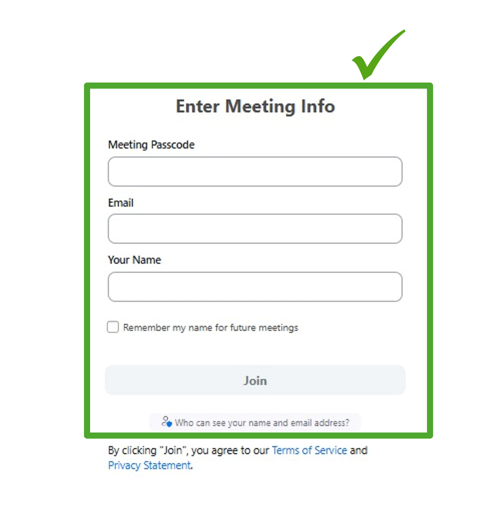 Participants see only passcode,email and name field.so, they can join without any issue